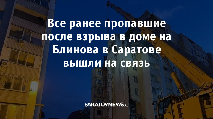 Граждане, которые ранее числились пропавшими без вести после взрыва в многоэтажке на улице Блинова в Саратове, вышли на связь. Об этом 27 июля сообщили в пресс-службе правительства Саратовской области, передаёт ТАСС.