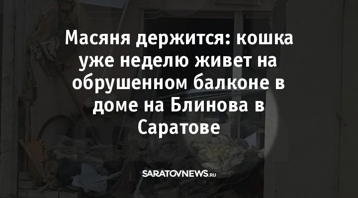 В Саратове на руинах дома на улице Блинова, где произошёл взрыв газа, уже почти неделю остается кошка по кличке Масяня, сообщает Mash. Животное, упавшее на балкон разрушенного здания, не может выбраться самостоятельно, а спасатели пока не могут добраться до него из-за опасности новых обрушений.