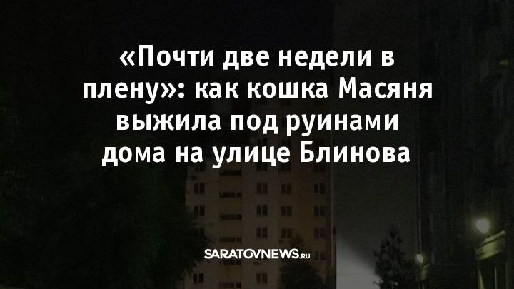 На улице Блинова в Саратове спасатели достали из-под завалов кошку по кличке Масяня. Почти две недели животное пряталось среди обломков многоэтажки, разрушенной взрывом. Об этом сообщает мэрия со ссылкой на ГТРК «Саратов».