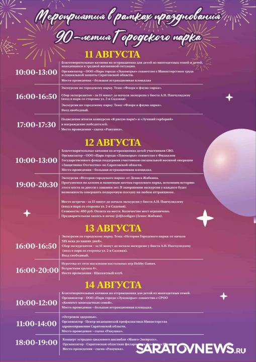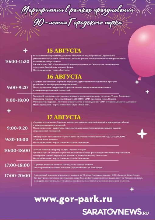 17 августа саратовскому городскому парку исполняется 90 лет. В честь этого события планируются праздничные мероприятия, о чем сообщает администрация парка.