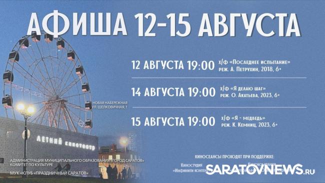 Саратовцам представили афишу (с 12 по 15 августа) летнего кинотеатра на Новой на бережной.