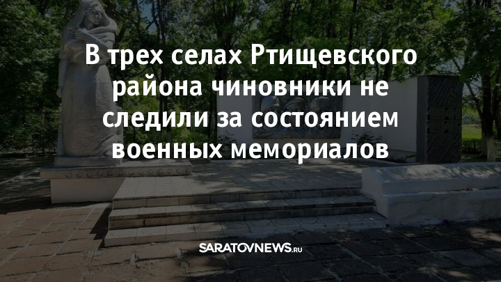 «На территории трех сельских поселений Ртищевского муниципального района Саратовской области расположены памятники, посвященные землякам, погибшим в годы Великой Отечественной войны. В ходе осмотра указанных объектов установлено, что они находятся в ненадлежащем состоянии», - сообщает региональное надзорное ведомство.
