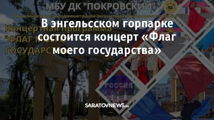 23 августа в городском парке «Покровский» (город Энгельс) состоится концерт «Флаг моего государства». Мероприятие подготовили творческие коллективы ДК «Покровский».