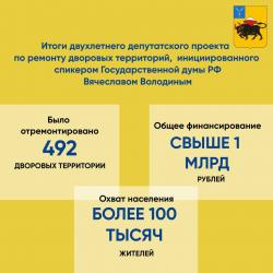 Благодаря реализации этого проекта за два года были благоустроены 492 дворовых территории. Комфортные условия проживания созданы для более 100 тысяч жителей. За два года обновилось беспрецедентное количество дворов – это то, чего жители ждали много лет. Общее финансирование проекта свыше 1 миллиарда рублей.