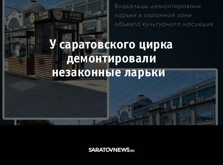 В Саратове у цирка имени братьев Никитиных на улице Чапаева, 61 демонтированы незаконно установленные торговые киоски и мини-аттракцион. Как сообщает областной комитет культурного наследия, предприниматели разместили точки по продаже лимонада и кофе в охранной зоне объекта культурного наследия, что запрещено утвержденными в 2021 году регламентами.
