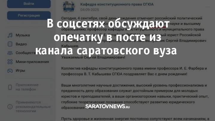В соцсетях учреждения опубликовали поздравление с днём рождения, адресованное выпускнику вуза, председателю комитета Госдумы по науке и высшему образованию, заслуженному юристу РФ Сергею Кабышеву. Однако человек, который публиковал текст, допустил опечатку – вместо «Дума» написал «Дура».