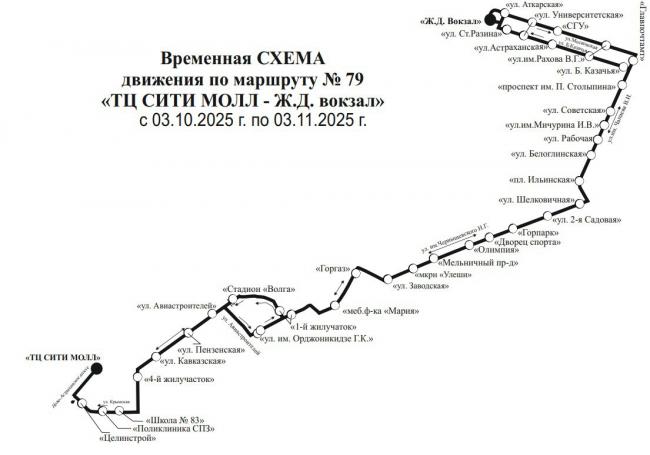 С 3 октября автобусы № 79 будут курсировать не по привычной схеме. Теперь их путь будет начинаться у железнодорожного вокзала и заканчиваться у торгового центра «СИТИ МОЛЛ». Обратный рейс также будет осуществляться по этому пути.