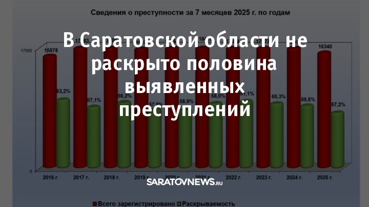 В Саратовской области с января по июль 2025 года было выявлено 16340 преступлений. Как сообщает прокуратура региона, из них удалось раскрыть 9346 (57,2 процента).