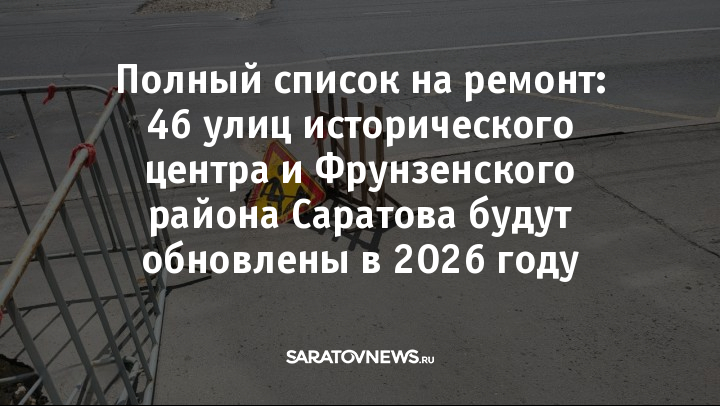 В 2026 году в исторической части Саратова и Фрунзенском районе стартует масштабный проект ремонта дорожного покрытия. При поддержке председателя Государственной думы Вячеслава Володина, правительства области и мэрии города планируется капитально отремонтировать 46 улиц и переулков. Финансирование будет осуществляться из федерального, областного и муниципального бюджетов.