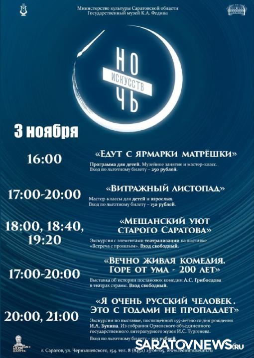 В Музее Федина сегодня пройдет «Ночь искусств», где состоятся мастер-классы, новые экскурсии и увлекательная программа для детей. Об этом сообщает региональное министерство культуры.
