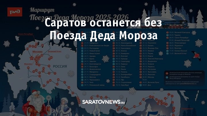 Маршрут, который стартует 19 ноября во Владивостоке и завершится 11 января в Великом Устюге, охватит Дальний Восток, Сибирь, Урал, Север и Европейскую часть России. Однако, как следует из опубликованного на сайте РЖД списка городов, Саратовская область вновь оказалась в числе проигнорированных регионов. Особую обиду вызывает то, что специальный новогодний состав сделает остановки в соседних городах — Пензе, Тольятти, Саранске и Ульяновске, а также на станции Дно, но минует саратовские земли.