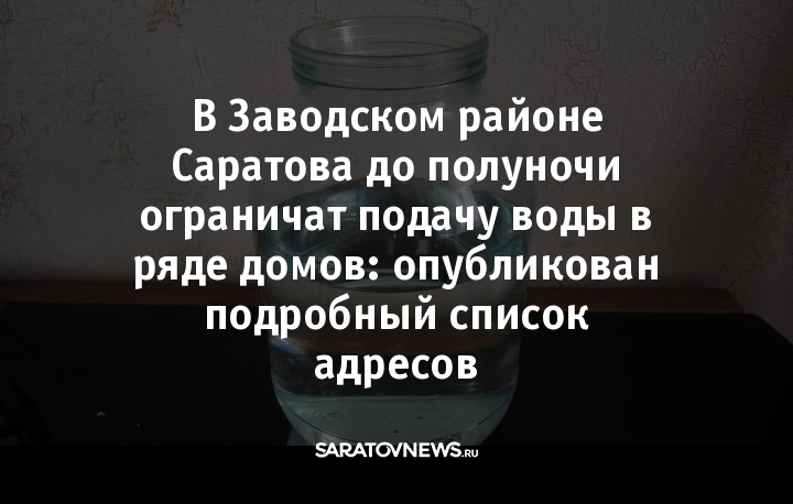 МУПП «Саратовводоканал» сообщило о масштабном отключении холодной воды 26 ноября. До 24:00 без водоснабжения остаются несколько улиц и микрорайонов в Заводском районе Саратова. Ограничения связаны с аварийно-ремонтными работами на сетях.