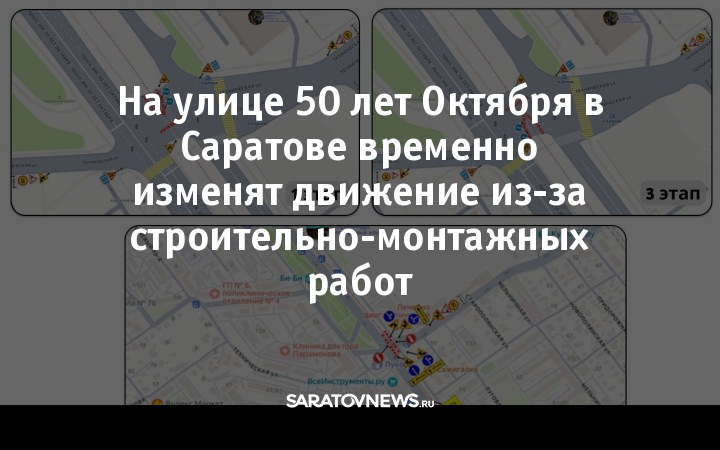 В Саратове на улице 50 лет Октября временно изменится организация дорожного движения. Об этом сообщили в городском комитете дорожного хозяйства и благоустройства. Ограничения связаны с выполнением строительно-монтажных работ в районе пересечения с улицей Технической.