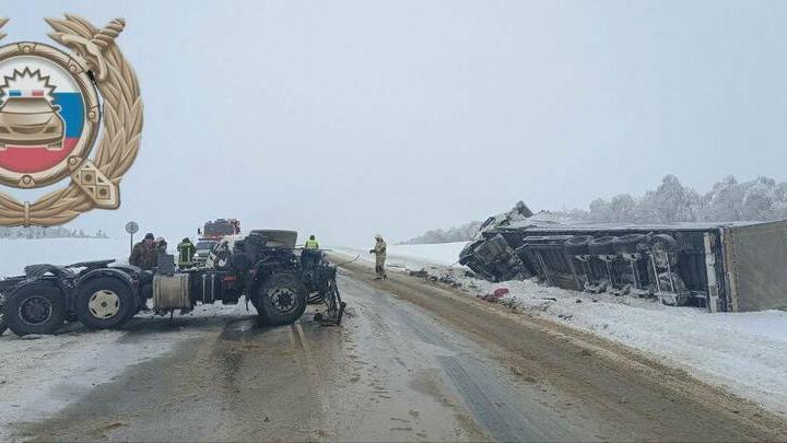 Авария случилась у села Первомайское в 11 утра. Столкнулись грузовики "КамАЗ" (с 32-летним водителем) и MAN (который вёл 51-летний мужчина). Судя по фотографии с места ДТП, после удара фура "лёгла" на обочину, второй автомобиль стоит без кабины.