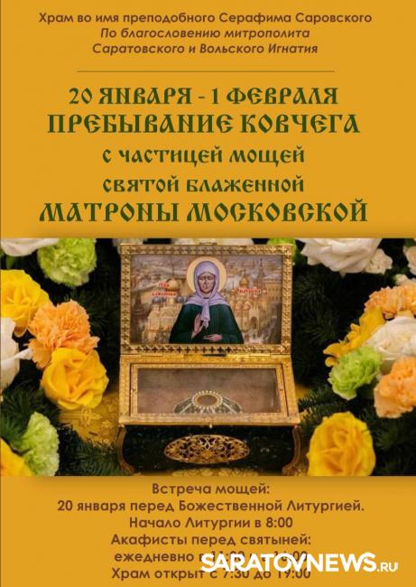 Святыня будет находиться в саратовском храме во имя преподобного Серафима Саровского с 20 января по 1 февраля. Торжественную встречу ковчега проведут 20 января во время Божественной литургии.