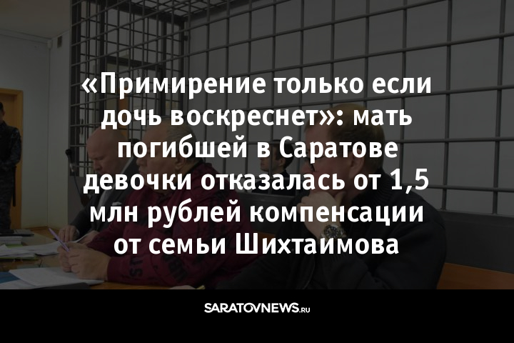 В Кировском районном суде Саратова прошло очередное заседание по делу Данияла Шихтаимова, обвиняемого в смертельном ДТП с 13-летней школьницей. Мать погибшей девочки в очередной раз отказалась от предложенной компенсации и заявила, что примирение сторон невозможно.