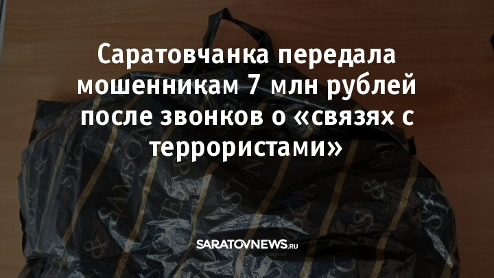 В назначенный день она приехала на улицу Производственную и вручила курьеру пакет с семью миллионами рублей. Только спустя четыре дня саратовчанка поняла, что стала жертвой обмана, и обратилась в полицию.