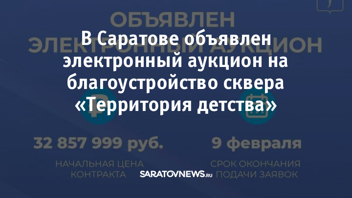 В Саратове мэрия объявила электронный аукцион на благоустройство сквера «Территория детства». Начальная цена контракта составляет 32 млн 857 тысяч 999 рублей 47 копеек.