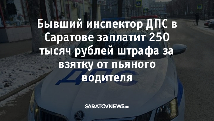 Бывший инспектор дорожно-патрульной службы в Саратове приговорён к штрафу в 250 тысяч рублей и запрету работать на госслужбе два года за получение взятки. Об этом сообщили в следственном отделе по Заводскому району города.