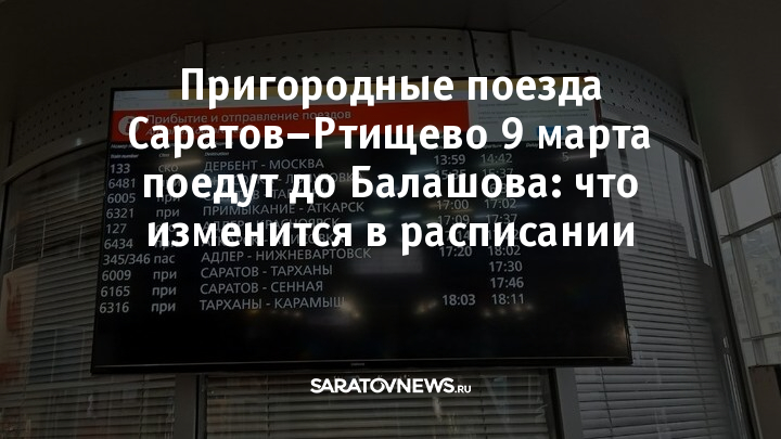 Вместо привычных поездов №6161 и №6162, которые обычно курсируют между Саратовом и Ртищево, 9 марта будут работать другие составы. Они отправятся в то же время, но проследуют дальше — до станции Балашов-1.