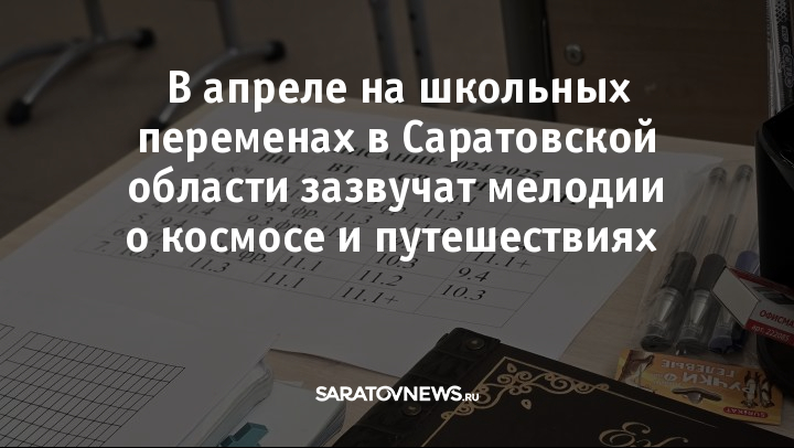 В саратовских школах в апреле на переменах вместо обычных звонков будут звучать музыкальные композиции, посвящённые космосу и путешествиям. Это происходит в рамках Всероссийского проекта «Мелодии вместо звонков» и приурочено ко Дню космонавтики.