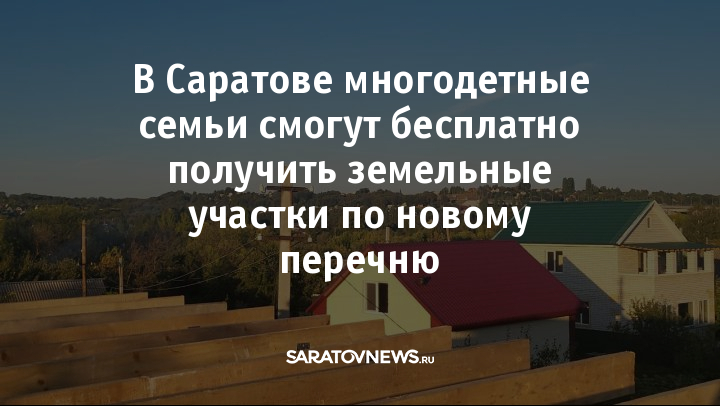 Комитет по управлению имуществом города Саратова утвердил перечень земельных участков, которые могут бесплатно получить многодетные семьи. Землю предоставят для индивидуального жилищного строительства, ведения личного подсобного хозяйства, садоводства или огородничества, сообщили в администрации города.