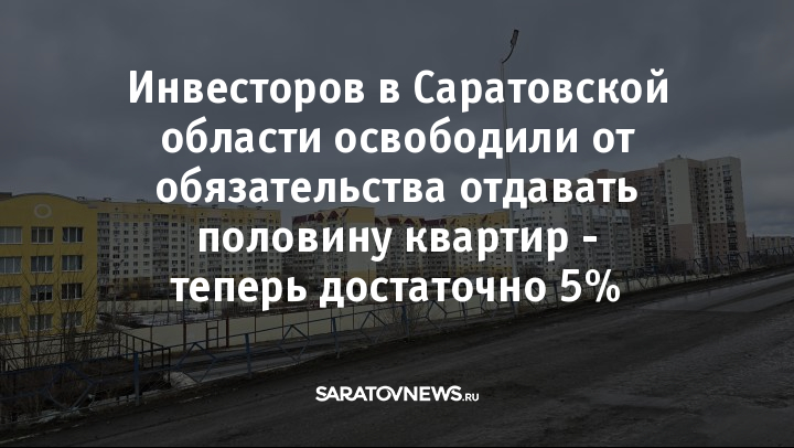 Депутаты Саратовской областной думы приняли изменения в закон «О земле», регулирующий передачу участков под застройку без торгов. Ранее инвестор, получавший землю, был обязан передать муниципалитету или региону не менее 50% всей жилой площади в построенном доме. Теперь эта доля снижена до «не менее 5%».