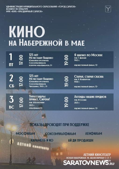 Администрация Саратова сообщила об открытии нового сезона кинопоказов под открытым небом на Новой набережной. Летний кинотеатр расположен по адресу: улица Шелковичная, 1, строение 1.