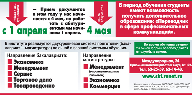 — Уважаемая Валентина, мы вас ждем. Вы обязательно получите у нас высшее образование. По программе подготовки бакалавров мы можем предложить вам направление «Экономика», которое имеет 4 профиля: «Бухгалтерский учет, анализ, аудит», «Финансы и кредит», «Мировая экономика», «Экономика предприятий и организаций» За четыре с половиной года по заочной форме обучения вы получите диплом о высшем образовании. Все для этого у нас есть. Как известно, наш вуз — это бывший Всесоюзный заочный институт советской торговли. То есть форма работы со студентами-заочниками у нас отработана десятилетиями. В апреле у нас начинается активная работа с абитуриентами, приезжайте к нам в институт, не пожалеете.