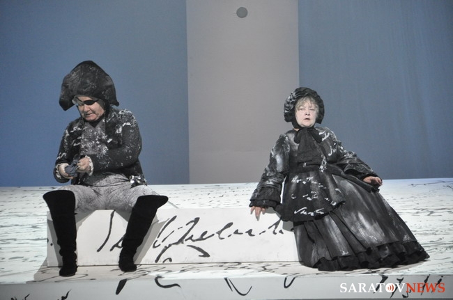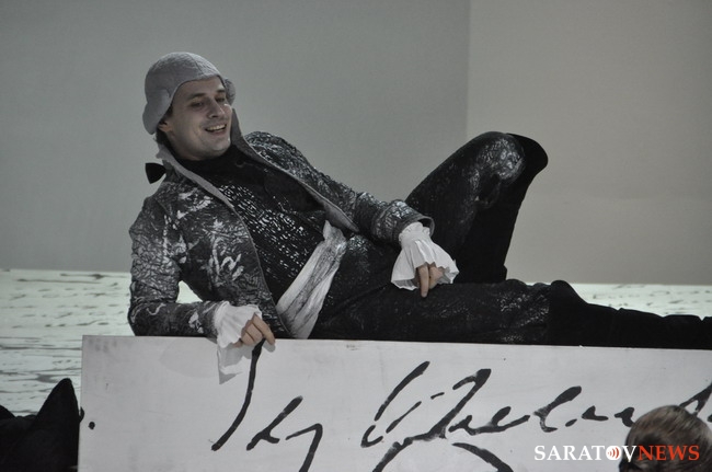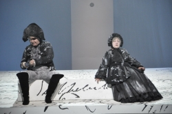 Что особенно ценно в премьерной постановке — художникам Харикову и Шавдатуашвили цветовым и световым решениями удалось создать атмосферу бескрайности российской жизни во всех смыслах — территориальной, действенной, стихийной, исторической. Пушкинский мелкий, как будто бисерный почерк пущен по всей сцене и захватывает все, что попадется ему на пути: экран, задник, белую и черную рамы, пол и даже костюмы. То ли строчки, то ли снег припорошил серые мундиры офицеров и кринолины дам. Да и вся эта история утопает в мелкой колючей пороше.