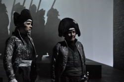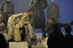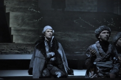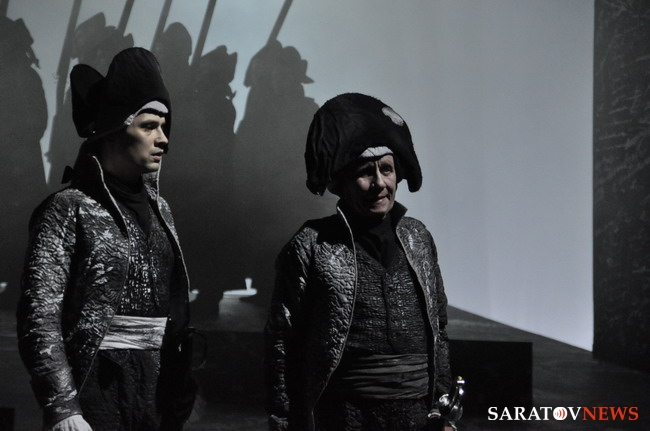 Постановка масштабнейшая — 42 человека на сцене (из них вся мужская часть труппы плюс приглашенный фольклорный ансамбль), 23 картины. Они динамично сменяют друг друга, и, что самое интересное, режиссер Шапиро сознательно не делает преференций истории любовной перед историей русского бунта.