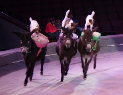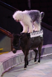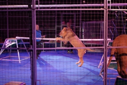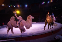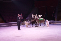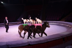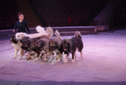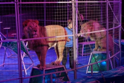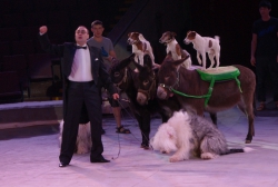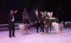 Ещё один, как говорится, «гвоздь программы» — аттракцион «В созвездии Льва» под руководством Ольги Борисовой. Семь грозных преогромных хищника, словно домашние котята, ласкаются к дрессировщице, ни разу не огрызнувшись, почти беспрекословно выполняют её указания: лезут наверх по лестнице, крадутся по прогибающимся под их немалым весом балкам, прыгают через обжигающие огнём барьеры. Очевидно, что прежде чем выводить дикое животное на манеж, дрессировщица тщательно изучила характер и повадки каждого хищника, просчитала, что у того или другого может получиться исполнить лучше всего, научилась «чувствовать» настроение каждого, учитывать их сиюминутные капризы и свойственные каждому предпочтения. В результате — слаженная и чёткая работа на манеже, уникальная сложность исполняемых трюков, кажется, что им всё нипочём, даже подняться на специальной площадке под купол цирка, правда, отважная женщина тоже рядом. Удивит своим уникальными возможностями и макак Рони под руководством Айдына Исрафилова, умеющий не только жонглировать, но и ездить самостоятельно на двухколёсном (!) детском велосипеде по барьеру манежа. Верблюды, по образному выражению эти «корабли пустыни», тоже вносят лепту экзотики и очарования в представление. Причём работают на арене они не одни, рядом танцуют, прыгают им на специально привязанное плоское седло, так называемое панно, грациозные наездницы. Выступают со своим номером учёные послушные дрессировщику ослики, к ним на спину с притороченным панно запрыгивают собаки различных пород и едут как наездники по кругу арены, при этом на одного из безотказных непарнокопытных забираются сразу несколько четвероногих каскадёров. В программе множество дрессированных животных, поскольку приурочена она к весенним каникулам, организаторы гастролей специально продумали этот момент, чтобы доставить наибольшую радость маленьким зрителям. Всё представление на манеже веселят публику выпускники Российского эстрадно-циркового училища — клоунский дуэт «МАПЕРКЕ». Мастерство всех без исключения исполнителей новой цирковой программы самого высокого профессионального уровня: артистичные канатоходцы на проволоке, виртуозные эквилибристы на лестнице и першах, бесстрашные воздушные гимнасты на корд де волане…