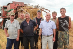 В тот день обмолот зерна вели все четыре комбайна «Дон», там на поле мы и познакомились с трудовой династией ДАЕВЫХ: братьями Анатолием и Сергеем, а младшее поколение представлял Алексей. Каждый профессионально управляет любой техникой, весной участвуют на тракторах в посевной, потом работают на культивации, а когда приходит уборочная страда, садятся за штурвал комбайнов. Мало ли ещё таких умельцев на селе? Думается, немало. Вот ещё один — Алексей ТУРУНТАЕВ. Механизатор. Передовик. За ним тоже закреплены несколько единиц техники и набор оборудования. Добросовестно работают на отвозе зерна водители Игорь АРТЕМЕНКО и Александр ДАМАЕВ.