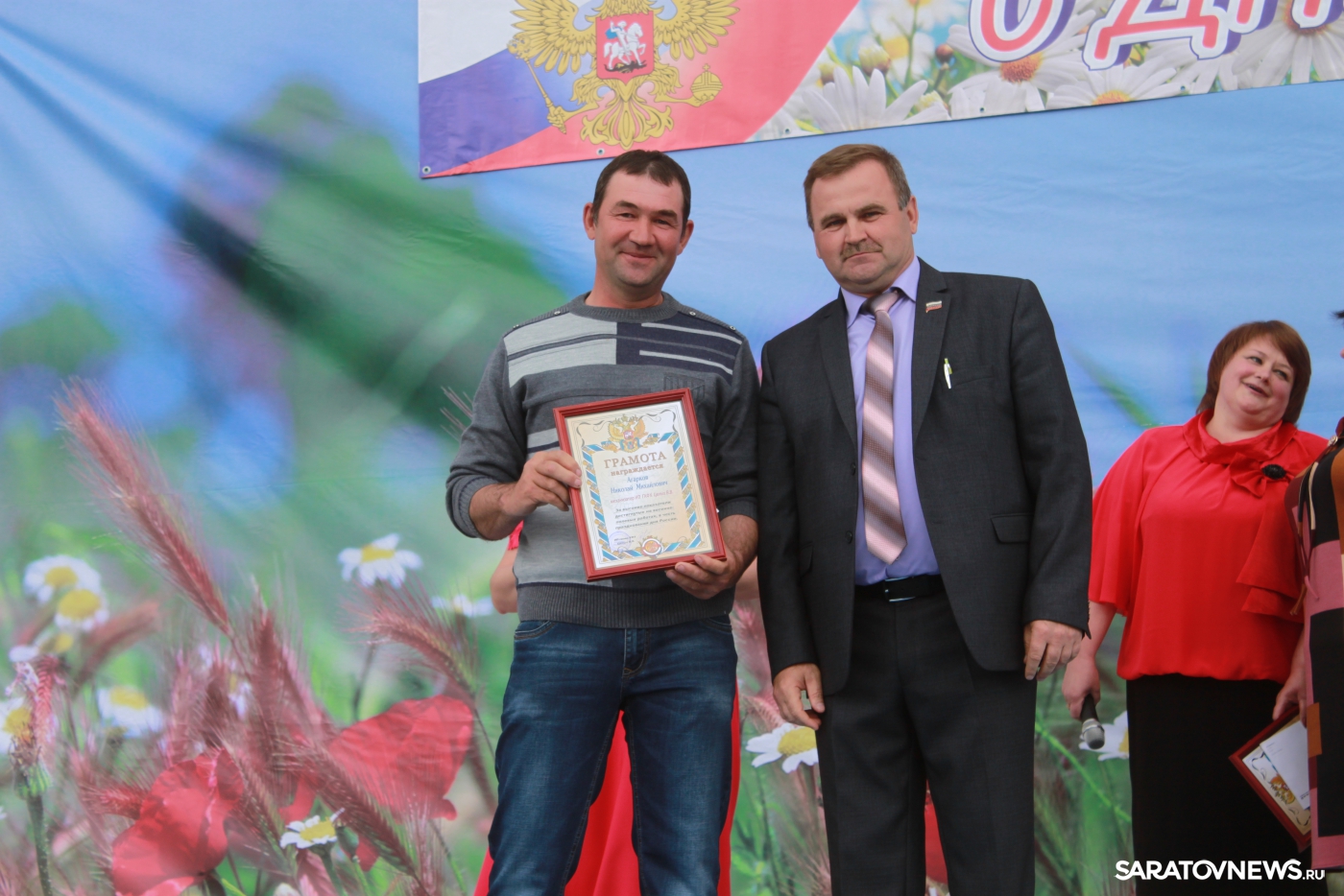 Один за другим на сцену выходили лучшие механизаторы, водители, токари, пастухи, доярки, агрономы, инженеры, бухгалтеры хозяйств района. Этих людей здесь знают в лицо, они являются гордостью трудовых коллективов, надёжными товарищами и крепкими семьянинами. В честь празднования Дня России и за высокие достижения в профессиональной деятельности благодарственными письмами председателя Саратовской областной думы в тот день были награждены водитель КФХ «Целых В.В.» Николай ГРАНКОВСКИЙ, агроном-семеновод КФХ «Целых В.В.» Елена КАЛАБИНА, бригадир КФХ «Целых В.В.» Виктор СЛАВНОВ, механизатор КФХ «Целых В.В.» Анатолий УКОЛОВ.