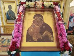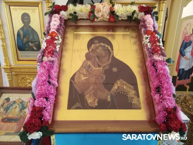 Во время нашей беседы епископ Тарасий обратил внимание на святыню храма Покрова Божией Матери — точный список чудотворной иконы Пресвятой Богородицы «Донская», который был освящён в Донском монастыре Москвы патриархом Кириллом. Эта святыня была доставлена в Балашовскую епархию в 2016 году в год 200-летия основания храма Покрова Божией Матери.