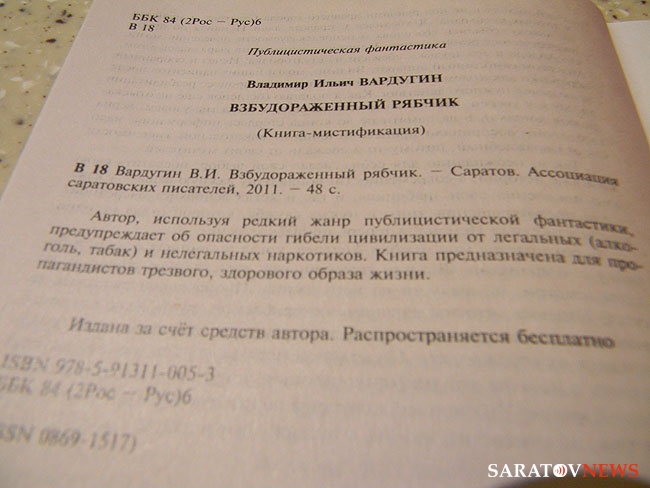 Также волонтеры принесли с собой раздаточный материал - диски о том, как бросить курить и пить, газету общества трезвости "Вопреки" и брошюрку с литературным произведением. В книге "Взбудораженный рябчик", написанной, как указывается в аннотации, в жанре публицистической фантастики, автор Владимир Вардугин рассказывает, как в далеком будущем на раскопках "античного Саратова" непьющие археологи находят водку, после чего и начинаются все злоключения.