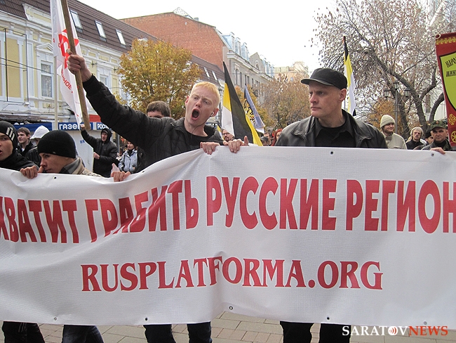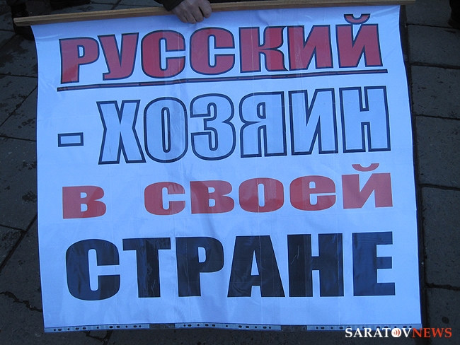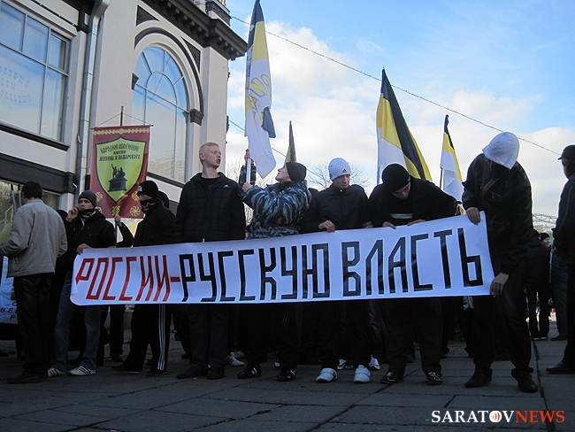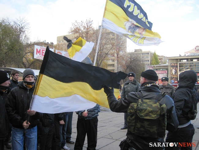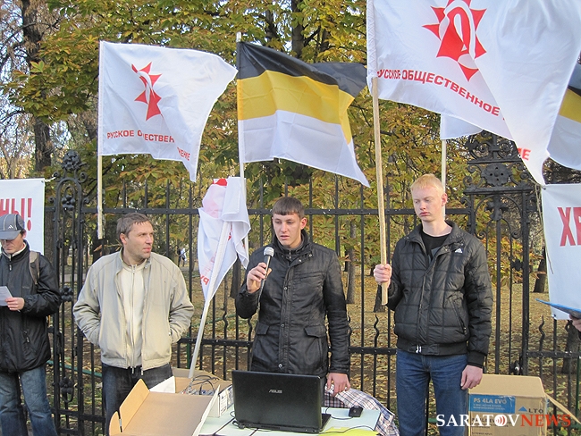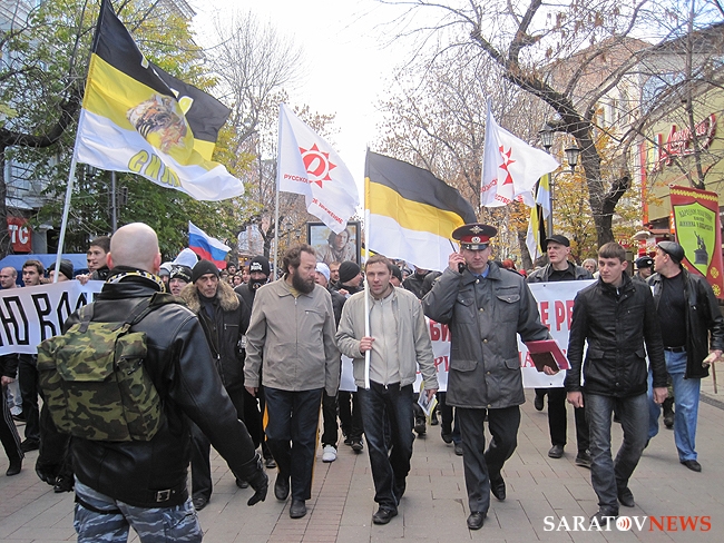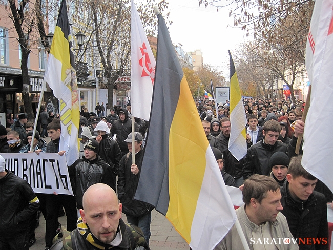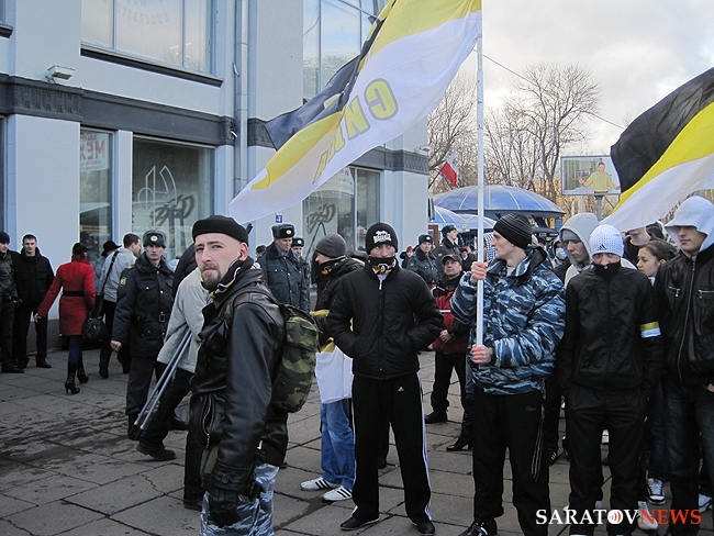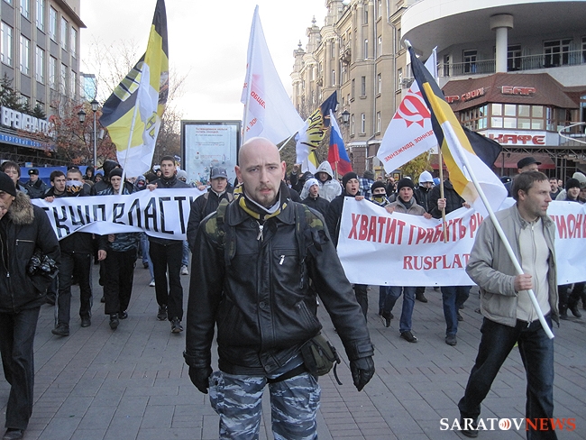 "Бей черных", - орал, шагавший в первой колонне митингующих, высокий мужчина средних лет. Позже, в беседе с корреспондентом Saratovnews, лидеры ультраправых организаций региона, сказали, что этого человека видят в первые, предположив, что он мог быть провокатором.