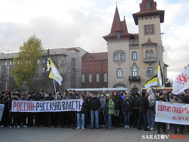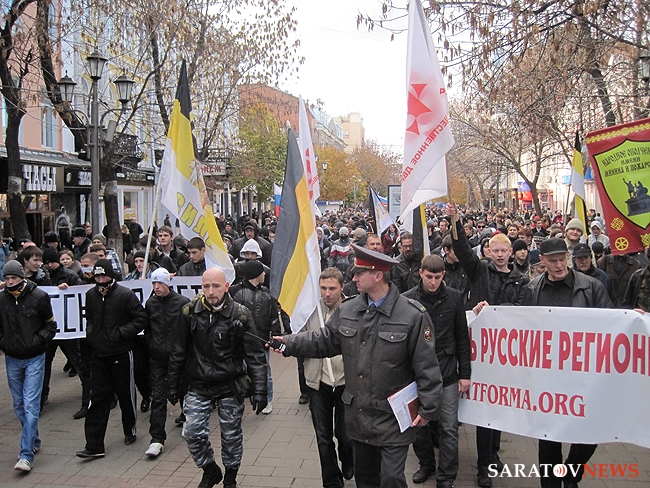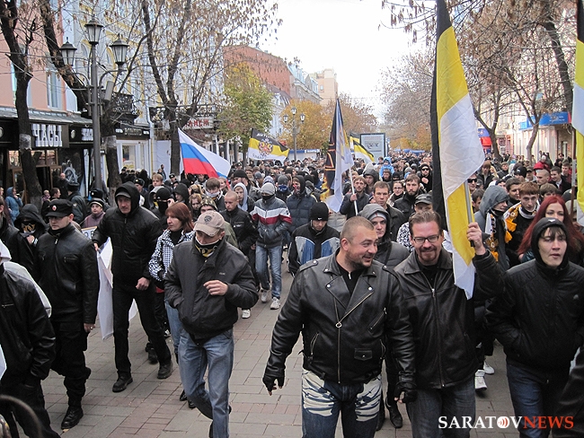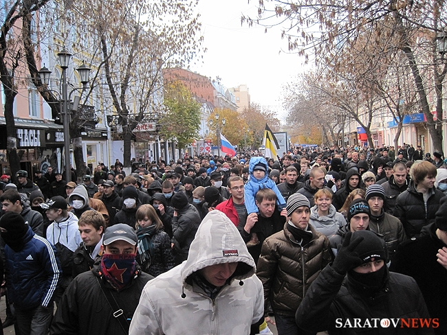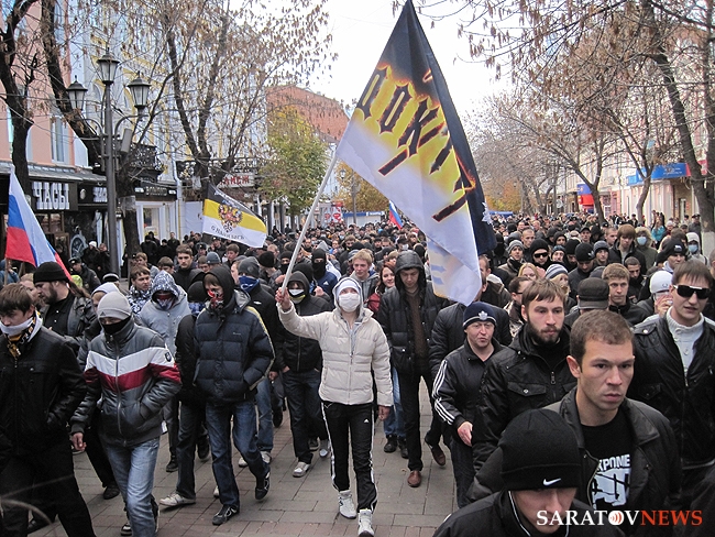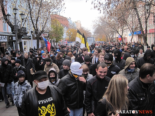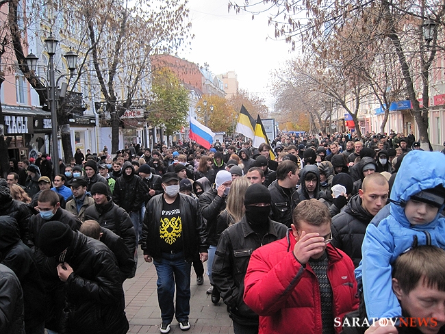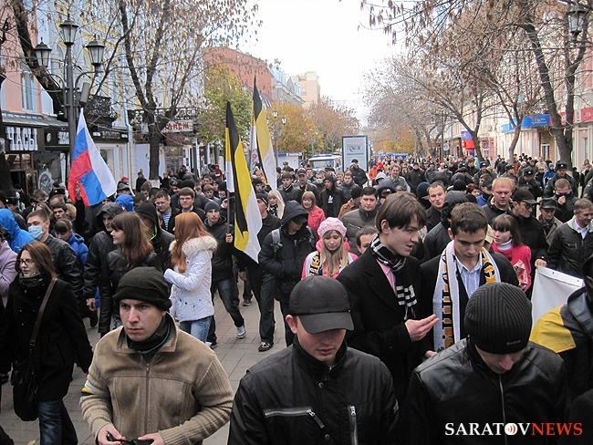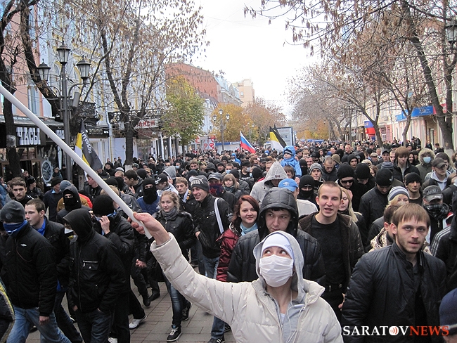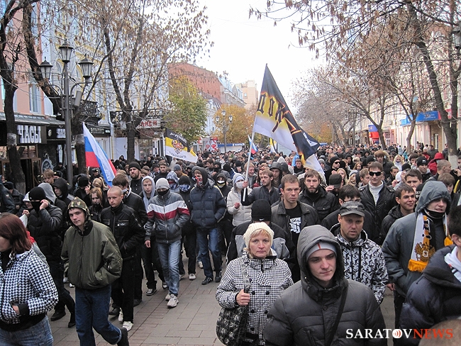 "Русский марш" в Саратове, состоявшийся 4 ноября, едва не закончился межнациональным конфликтом. Группа молодых людей в одежде с символикой махачкалинского ФК "Анжи" очень решительно выражали свое недовольство шествием. Двое из них было задержано полицией. Как выяснилось позднее, не обошлось без задержаний и среди активистов движений.