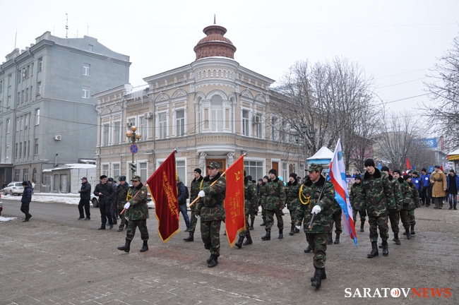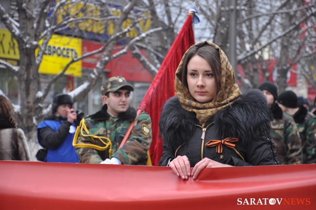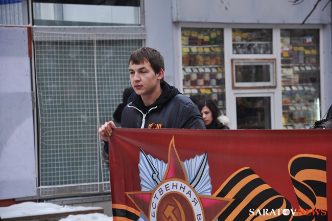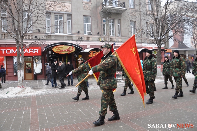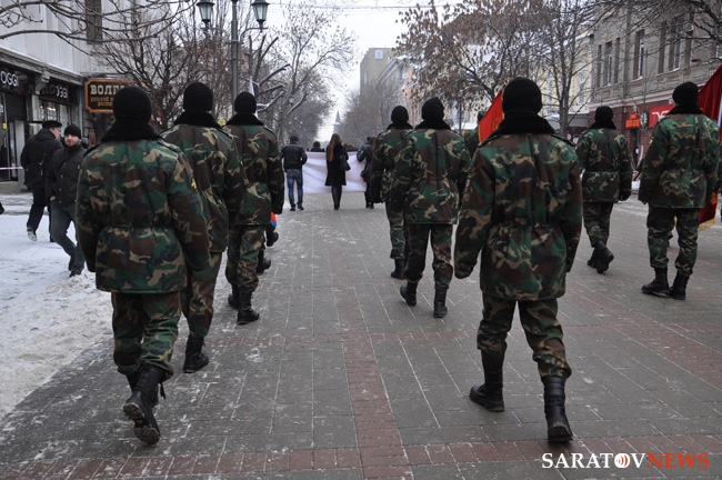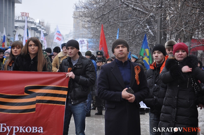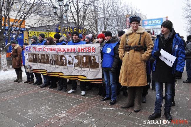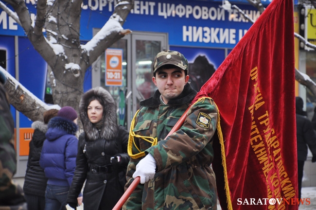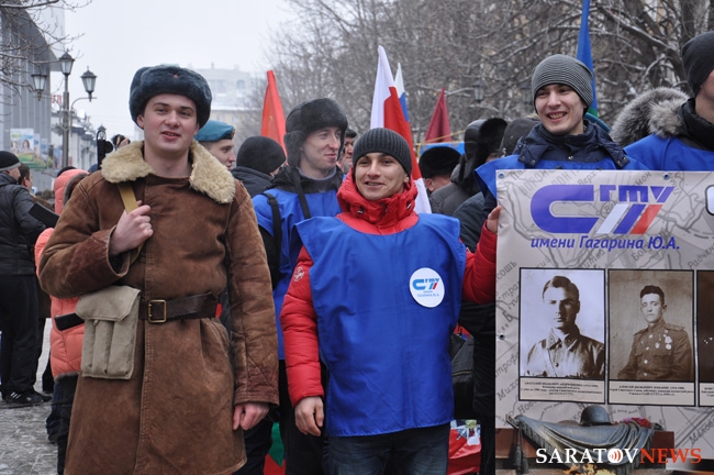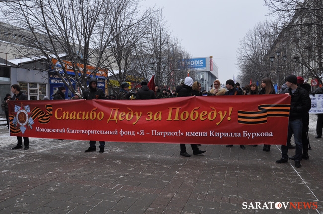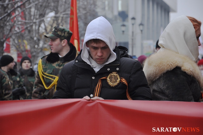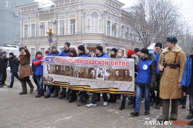 Сегодня в центре Саратова состоялось шествие, посвященное празднованию 70-летия со дня окончания Сталинградской битвы. Возглавили шествие военные и члены "Молодой гвардии" с транспарантом "Спасибо деду за победу. Молодежный благотворительный фонд "Я – патриот!" имени Кирилла Буркова". Расстановкой последних руководил депутат Саратовской городской думы Василий Артин. В молодежной колонне были замечены транспаранты и флаги Саратовской государственной юридической академии, Саратовского государственного технического университета и Приволжского института управления имени П.Столыпина.