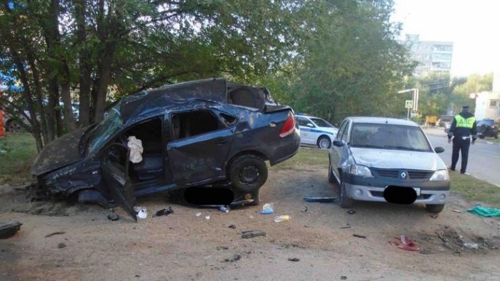 В Энгельсе "Гранта" слетела с дороги и повисла между деревом и столбом