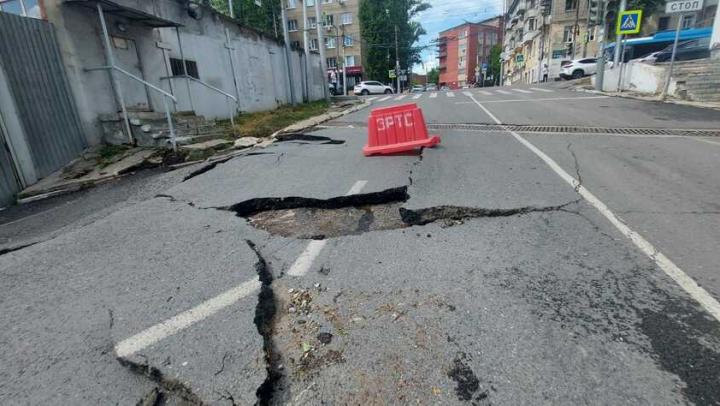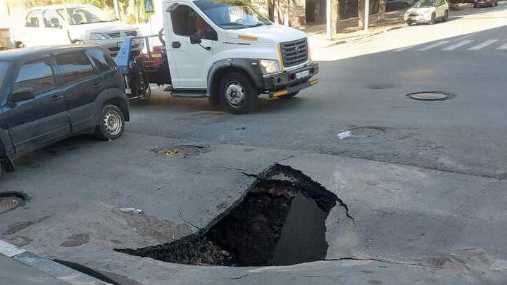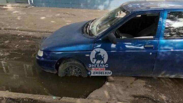 В Саратове на улице Радищева машина провалилась в яму на дороге