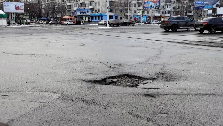 Яма на Сенной площади в Саратове мешает автомобилистам и общественному транспорту